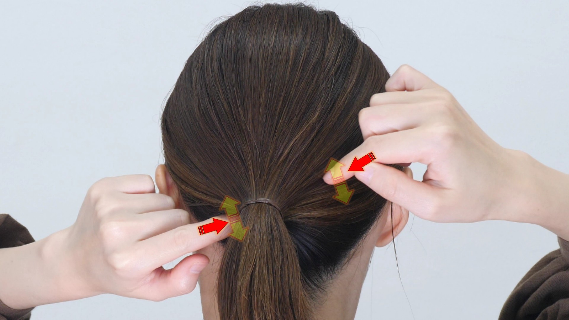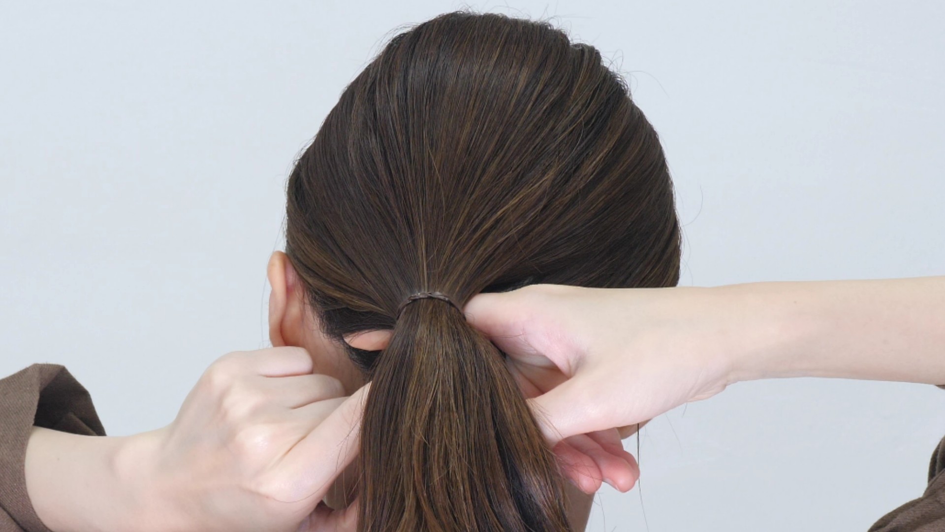片方の手で、ポニーテールを結んでいるゴム部分を抑えながら引き出します。