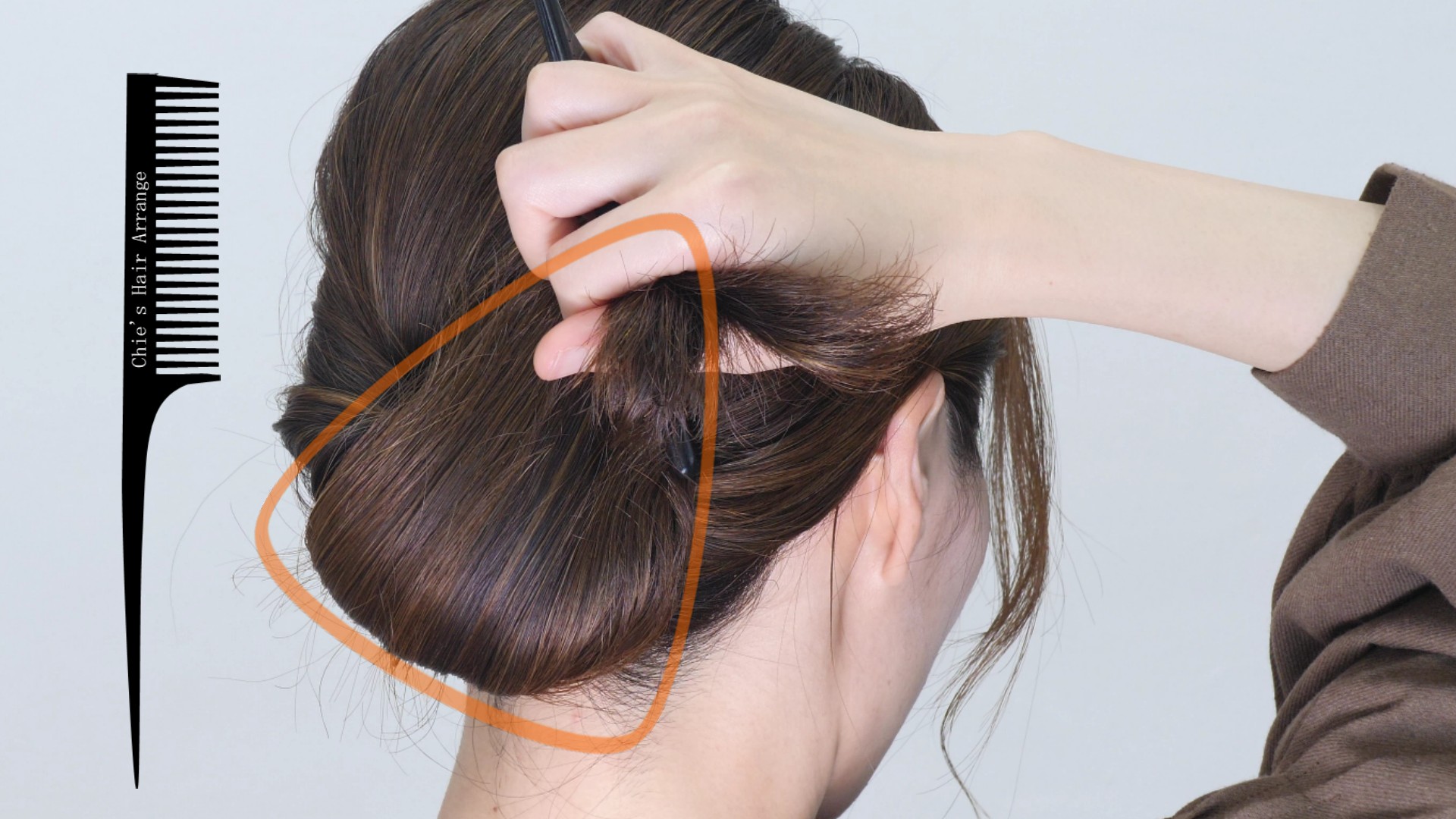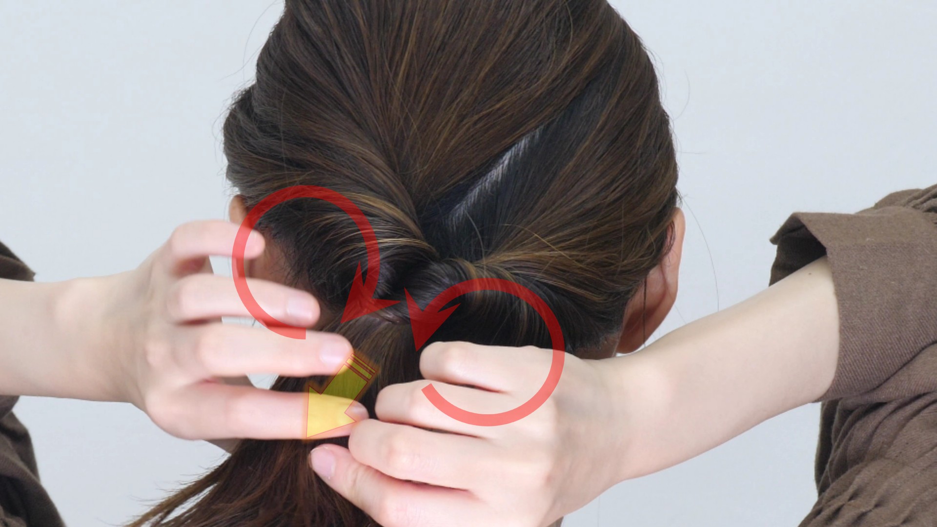 夜会巻きコームで少量の毛を掬うようにしながら、②の絵になるように夜会巻きコームを反転させます。