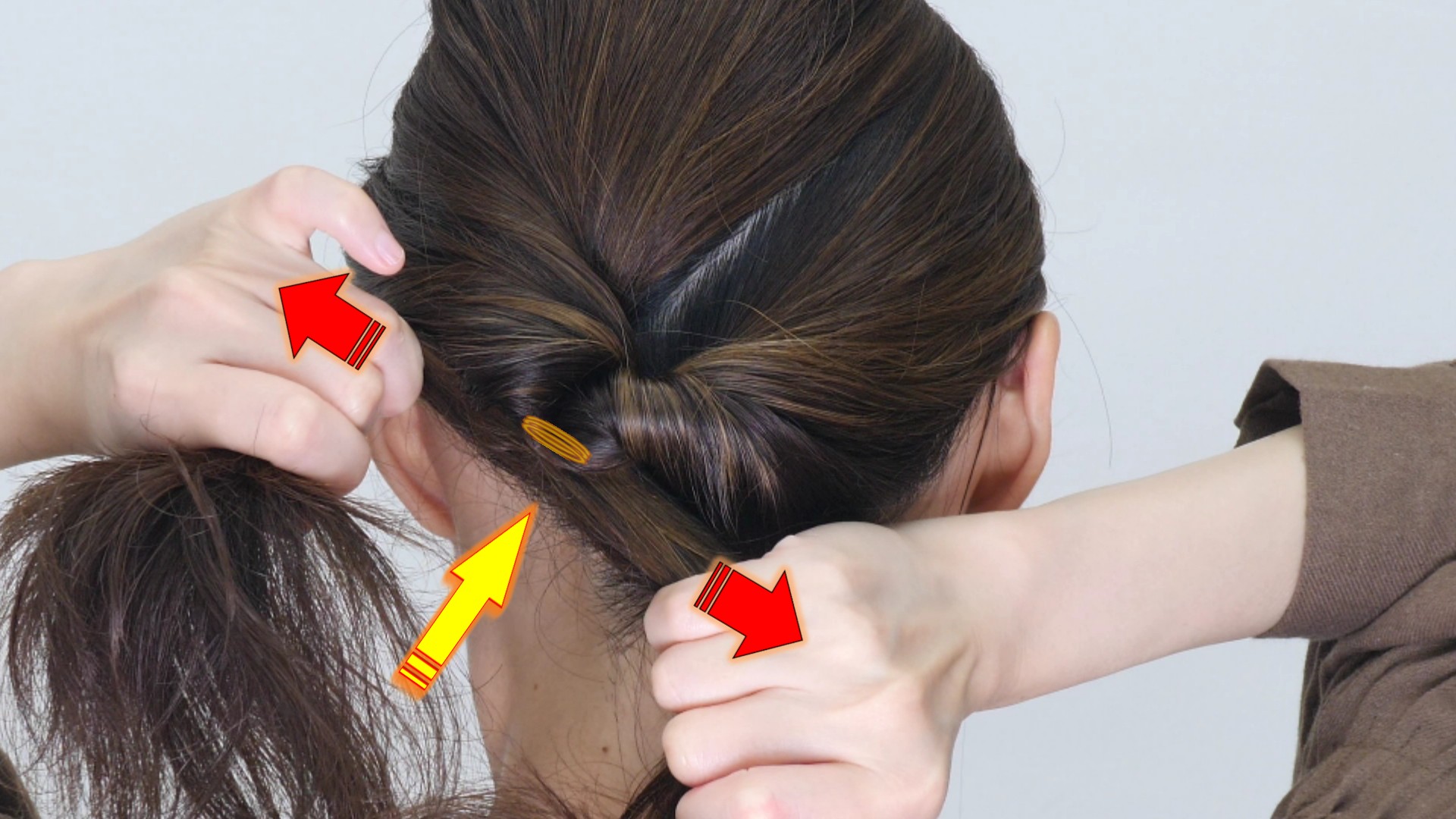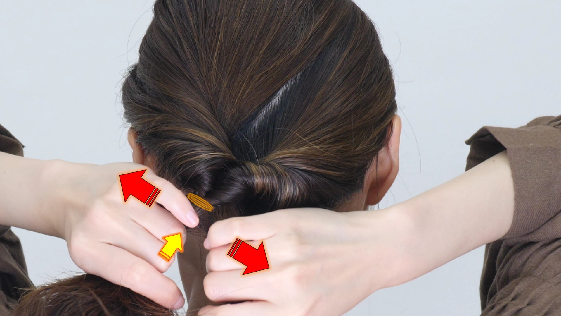 挿し込むまでは、左手は毛束が崩れないようにしっかりと抑えます。